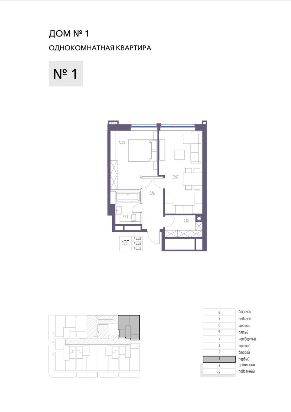 1-комнатная — 45,32 м² 1/8 эт. в Atlantida Living (Атлантида)
