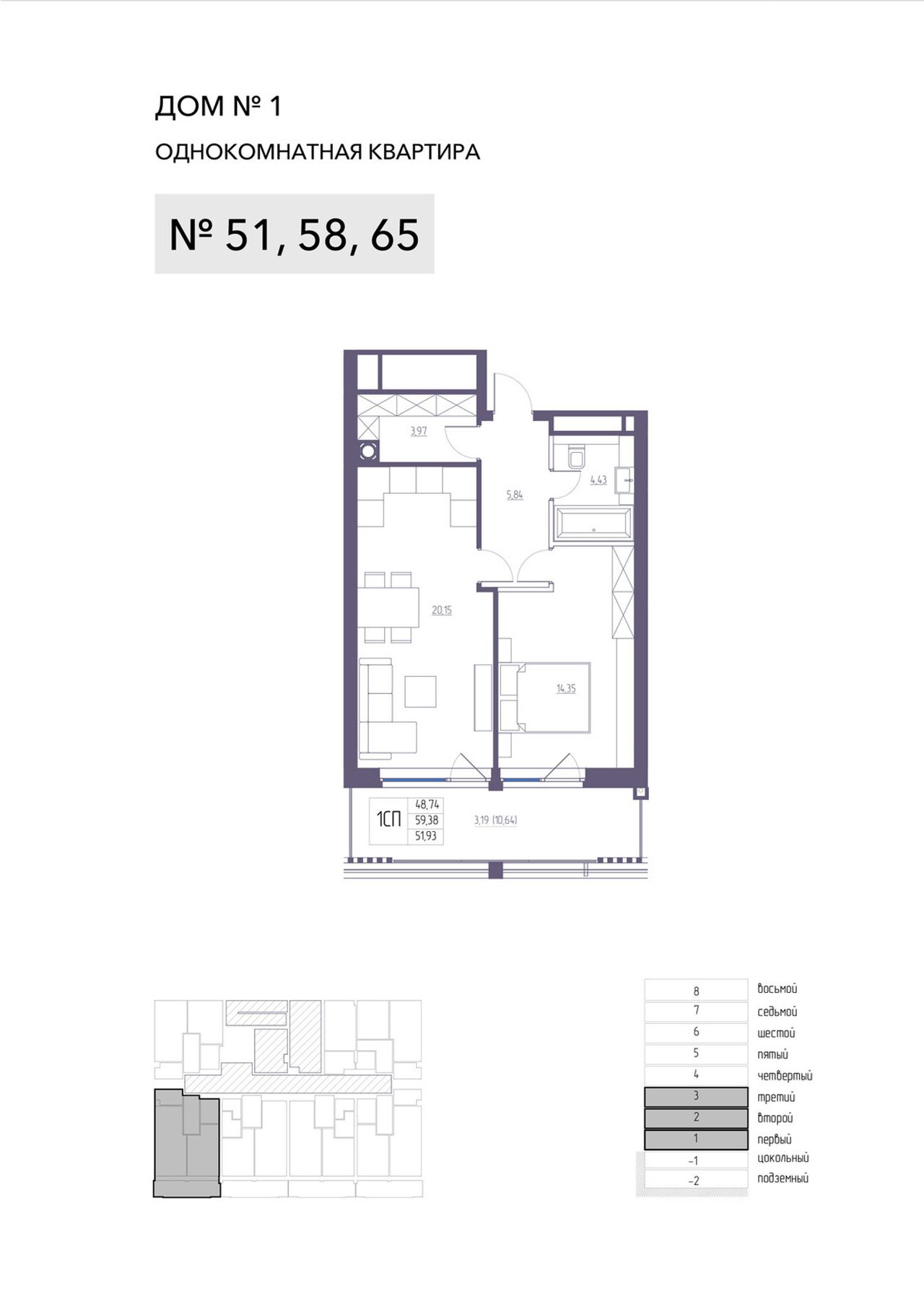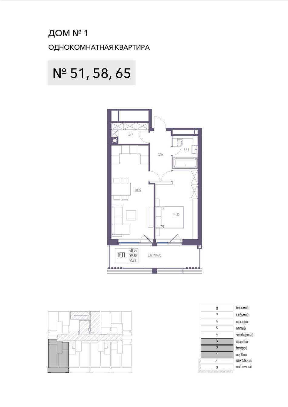 1-комнатная — 59,38 м² 2/8 эт. в Atlantida Living (Атлантида)