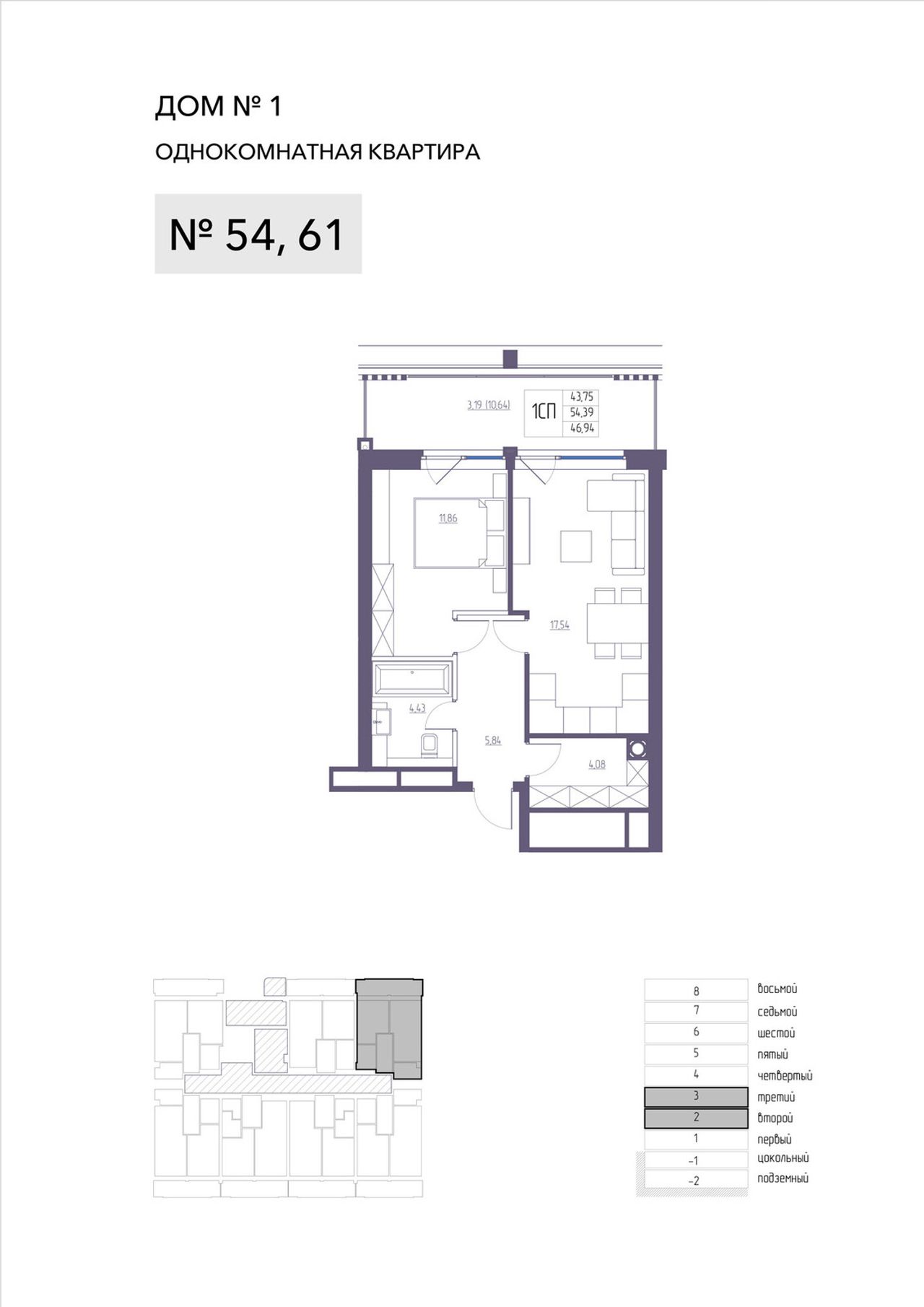 1-комнатная — 54,39 м² 3/8 эт. в Атлантида