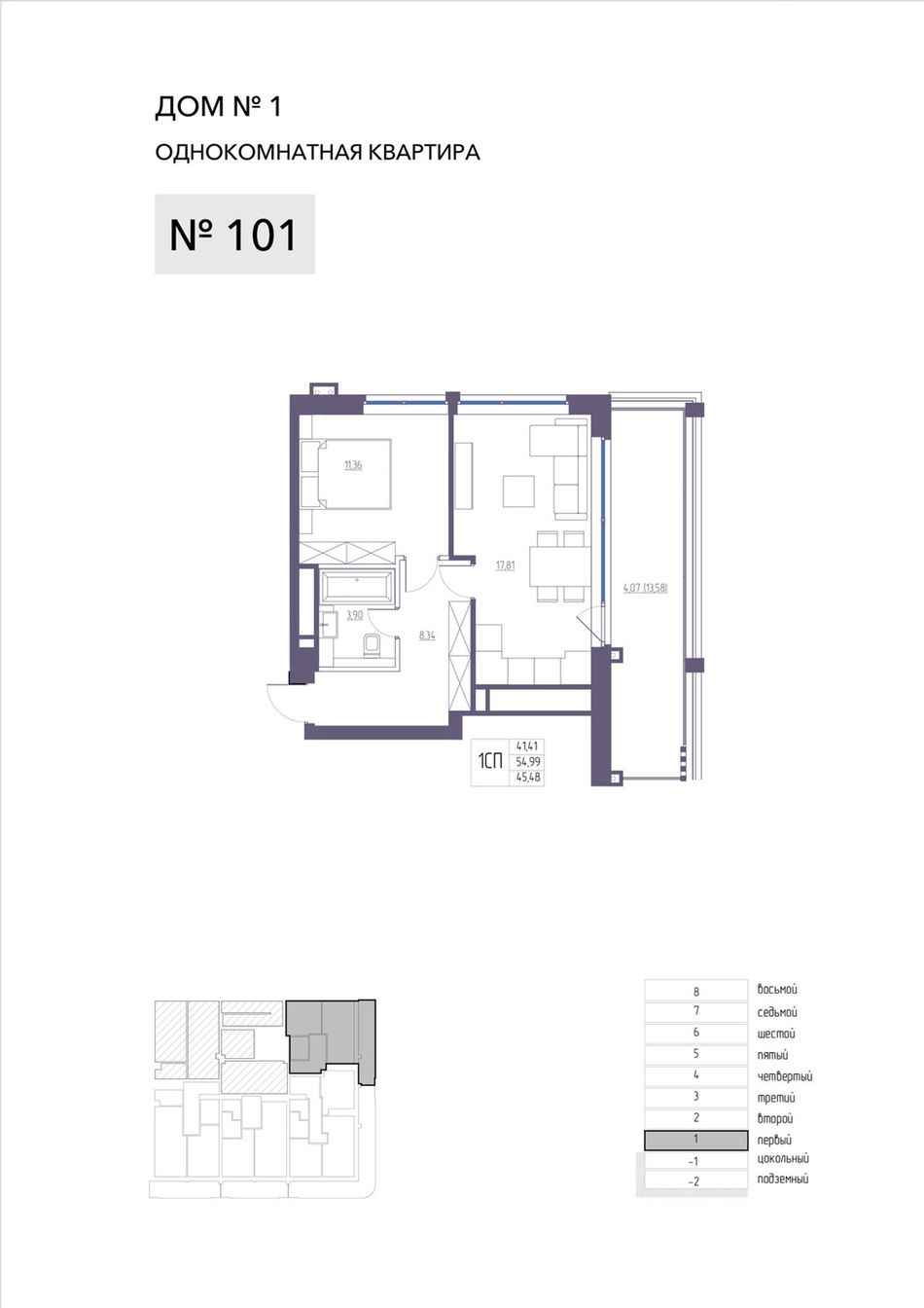 1-комнатная — 54,99 м² 1/8 эт. в Atlantida Living (Атлантида)