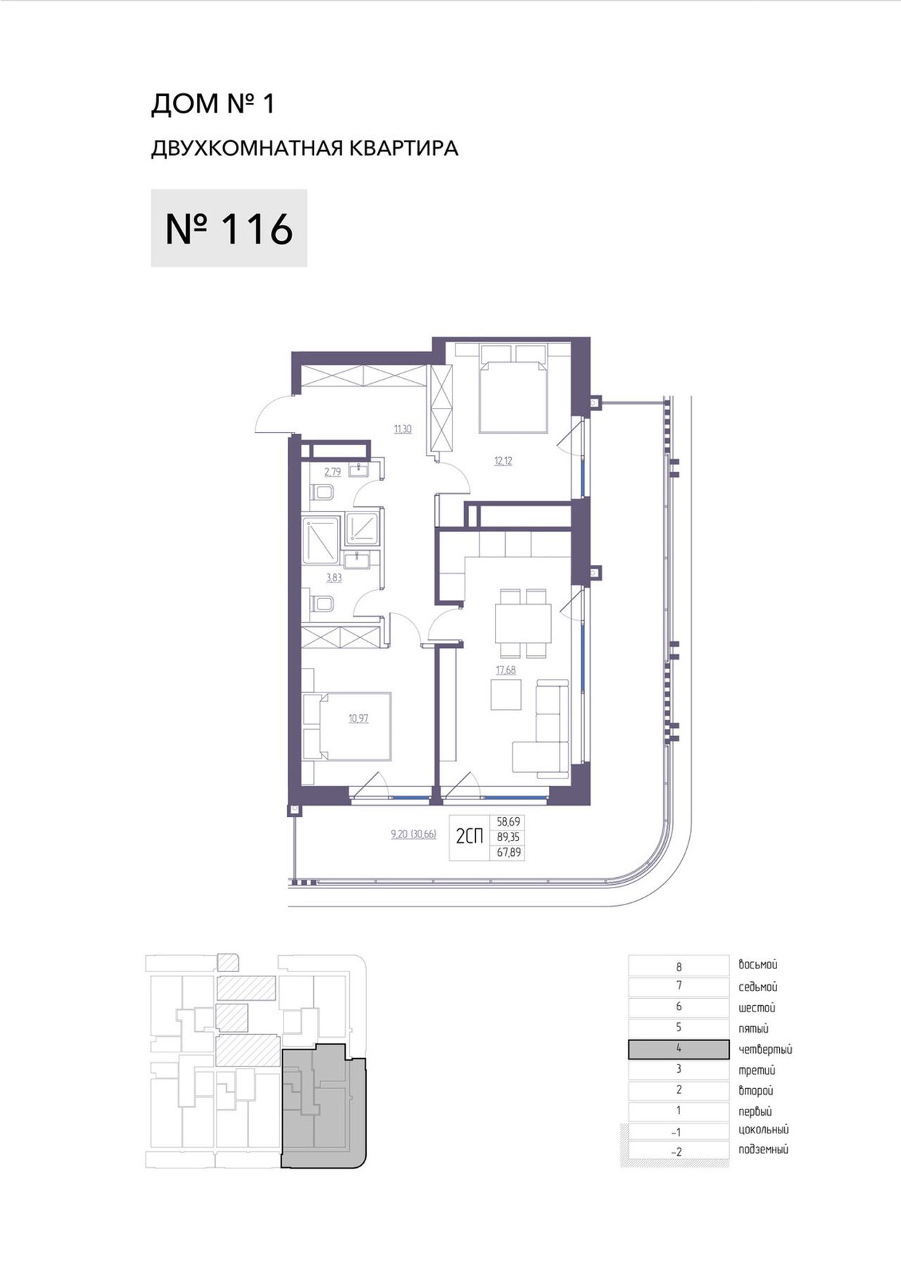 2-комнатная — 89,35 м² 4/8 эт. в Атлантида