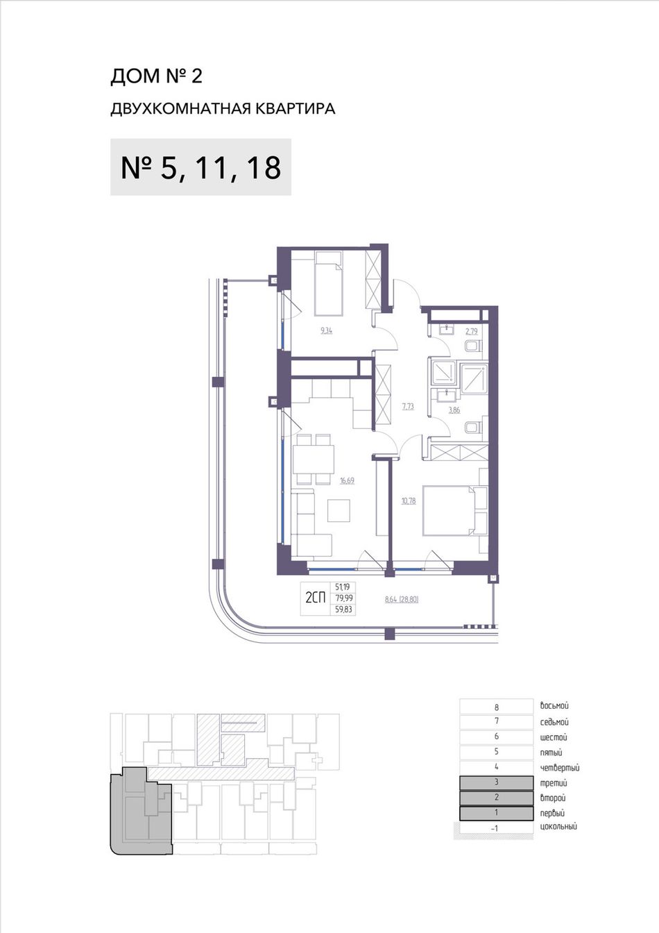 2-комнатная — 79,99 м² 1/8 эт. в Атлантида
