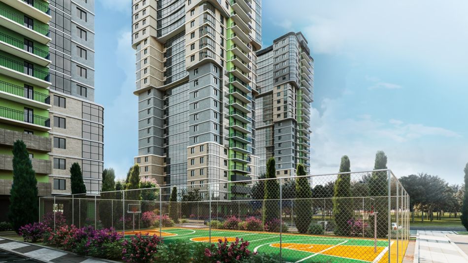 Яркие фасады с панорамным остеклением, благоустроенная территория, детские и спортивные площадки во дворе комплекса.