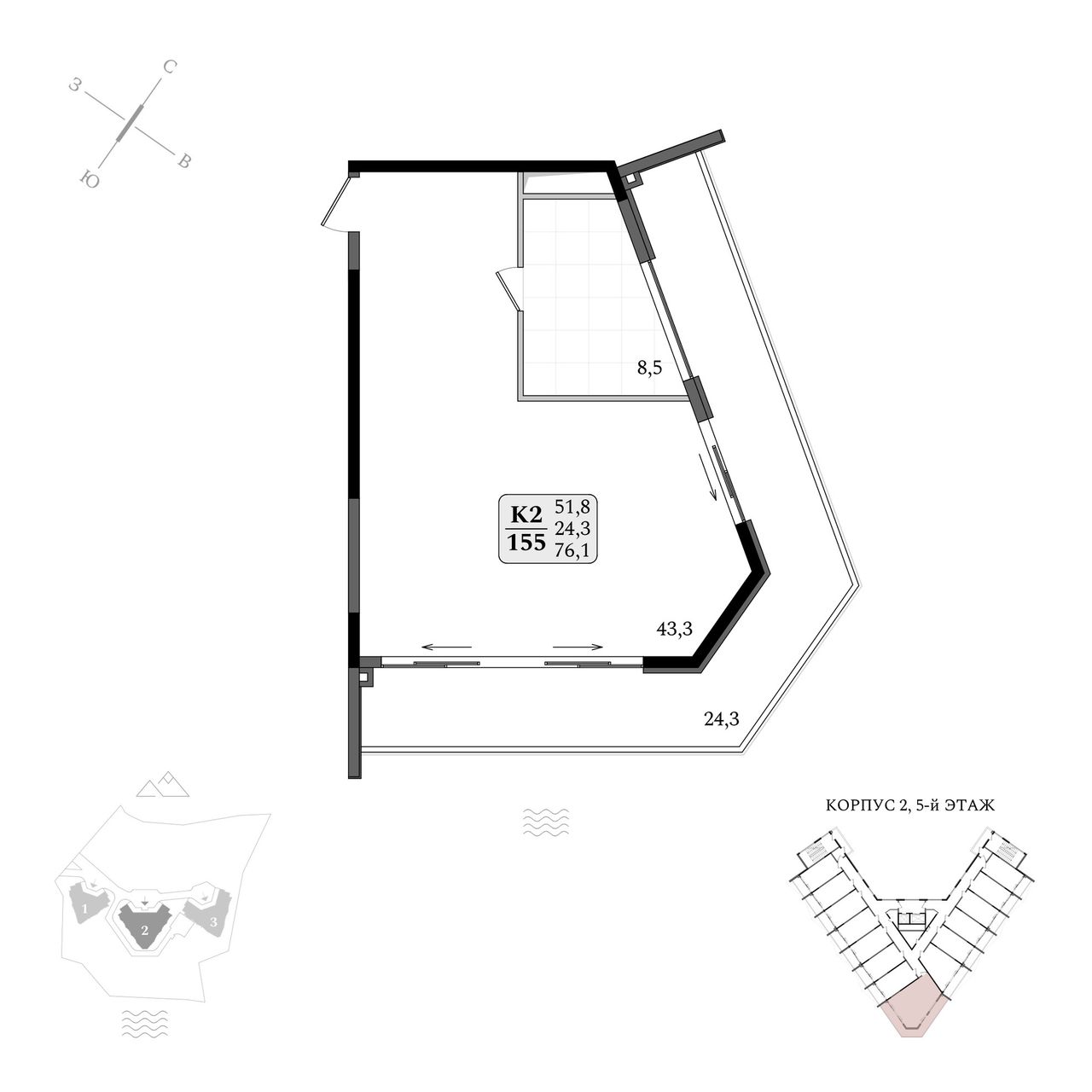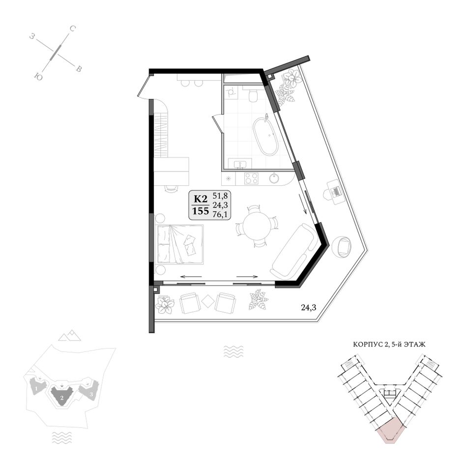 Комплекс обладает 100% видовыми характеристиками, а панорамные раздвижные окна позволяют любоваться пейзажами, не вставая с кровати.