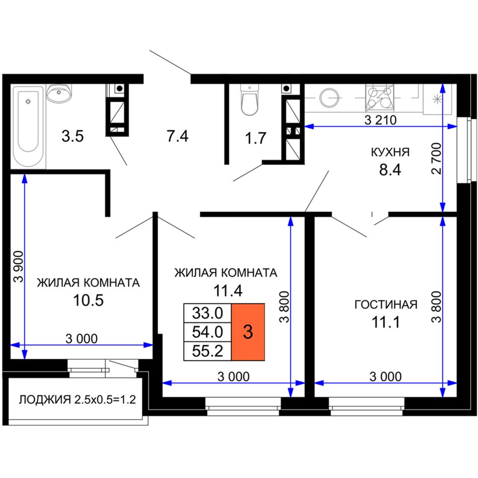 3-комнатная — 55,75 м² 11/16 эт. в Дыхание
