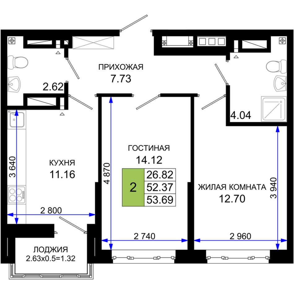 Общая площадь53,69 м²