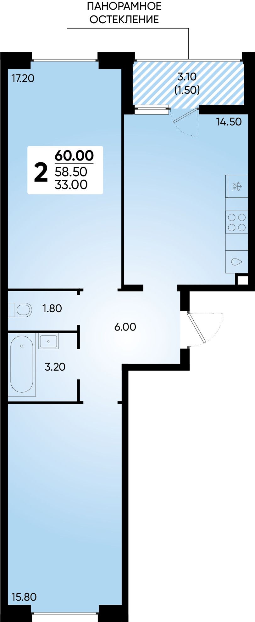 2-комнатная — 60 м² 2/18 эт. в Архитектор