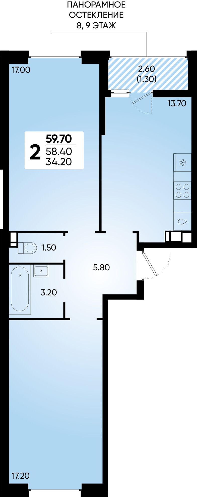 2-комнатная — 59,7 м² 9/18 эт. в Архитектор