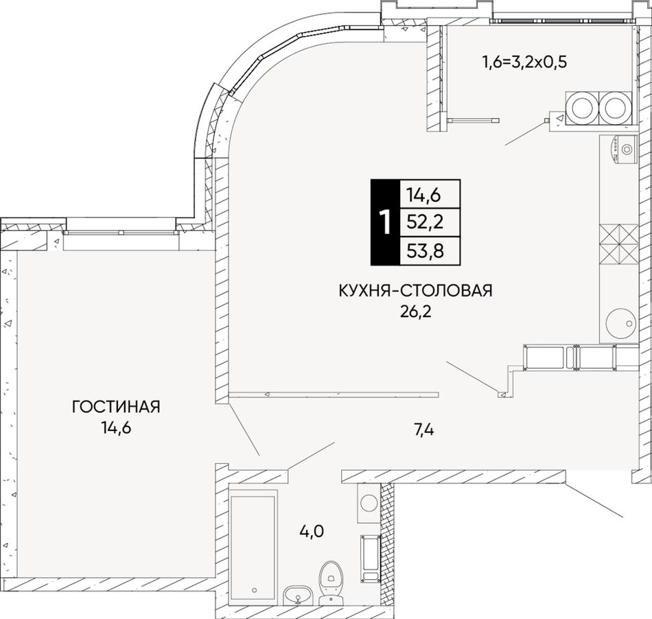 1-комнатная — 53,8 м² 20/24 эт. в Левобережье