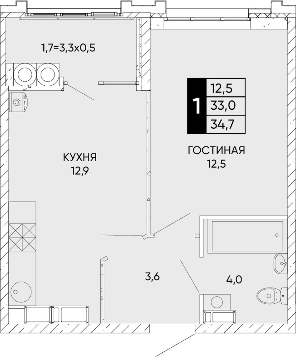 1-комнатная — 34,7 м² 24/24 эт. в Левобережье