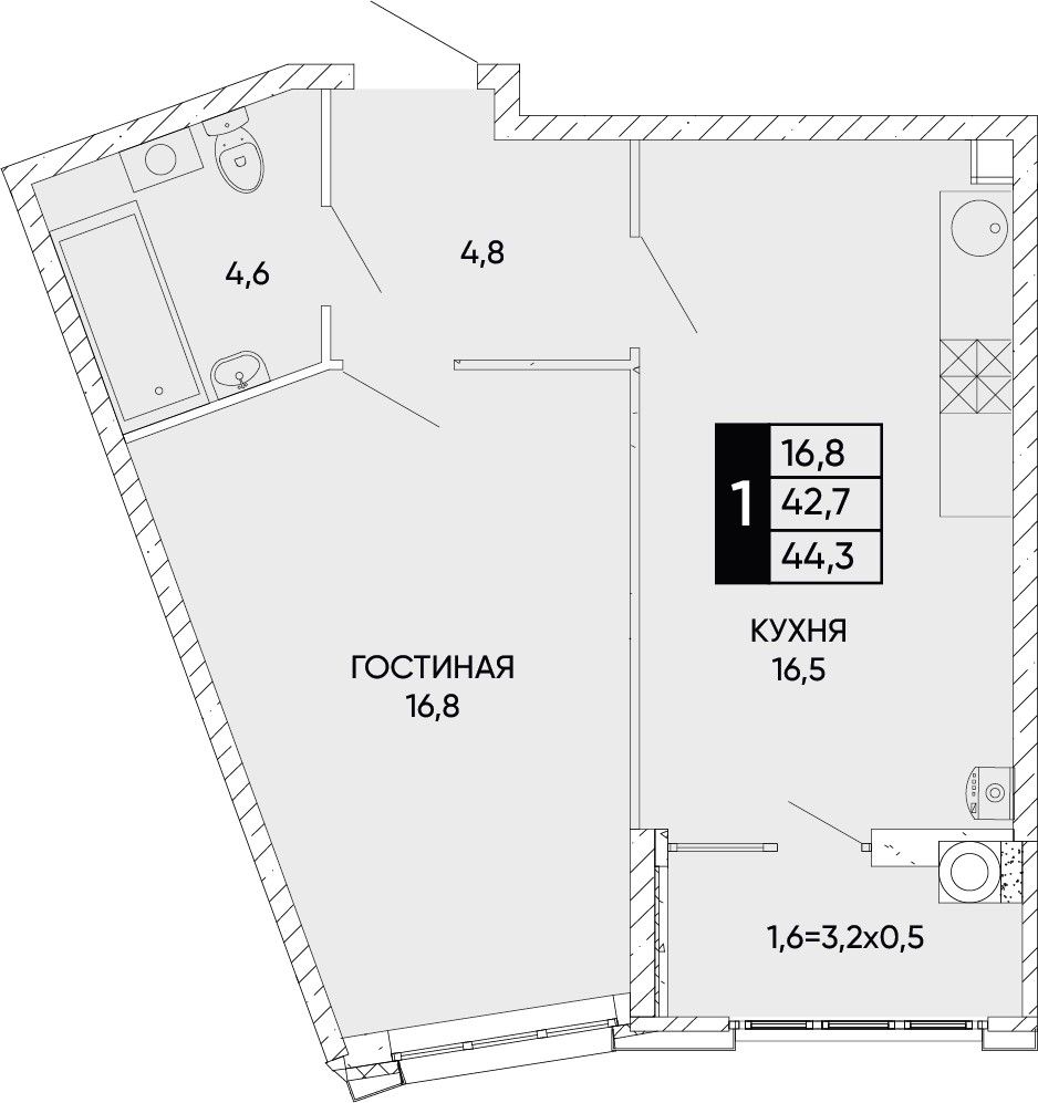 1-комнатная — 44,3 м² 2/22 эт. в Левобережье