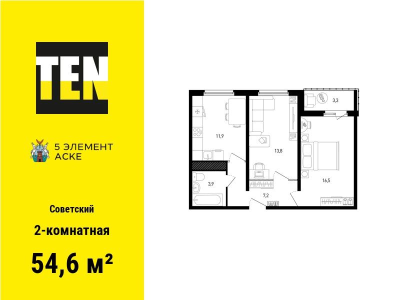 2-комнатная — 54,6 м² 3/15 эт. в 5 элемент Аске