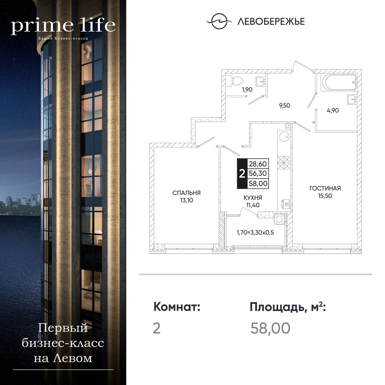 2-комнатная — 58 м² 1/24 эт. в Левобережье