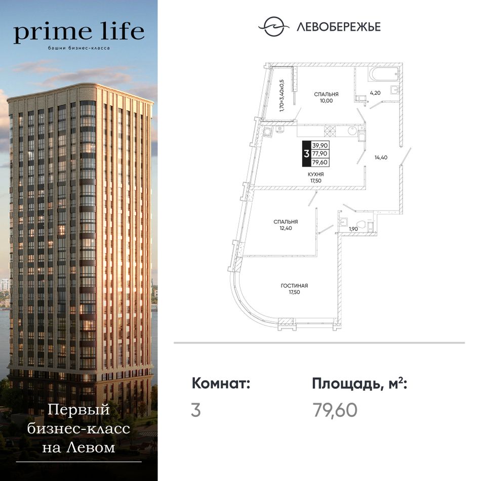 3-комнатная — 79,6 м² 3/24 эт. в Левобережье