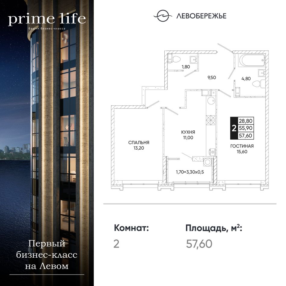 2-комнатная — 57,6 м² 3/24 эт. в Левобережье