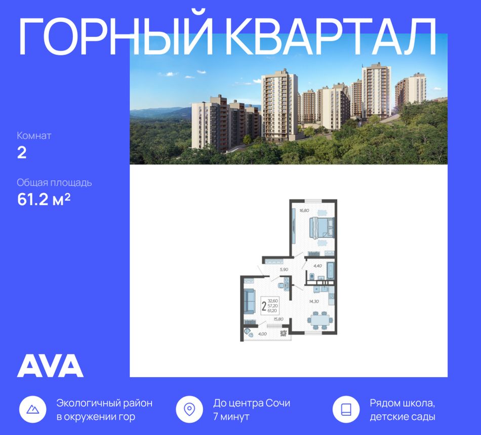 Продается 2-комнатная квартира в доме (Литер 3), срок сдачи : 3 кв. 2026, общей площадью 61.2 кв.м., на 5 этаже в новом современном жилом комплексе в Сочи «Горный квартал», Хостинский район. Отличный вариант для инвестиций и жизни.
