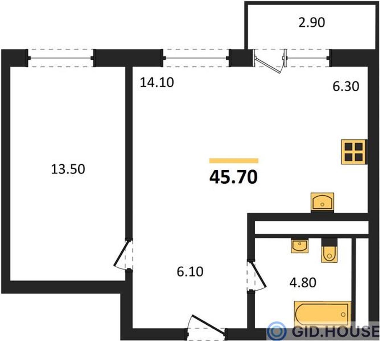 1-комнатная — 45,7 м² 2/25 эт. в ACADEMIA (АКАДЕМИЯ)