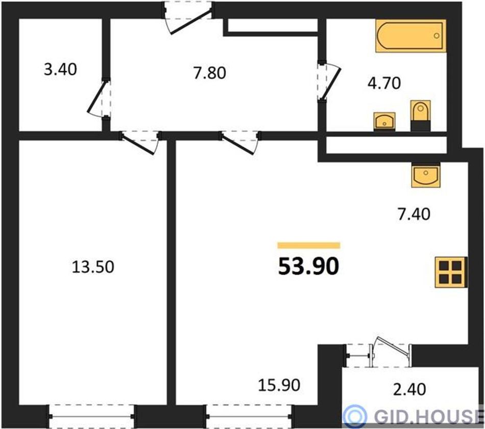 3. 1-комнатная, 53,9 м²