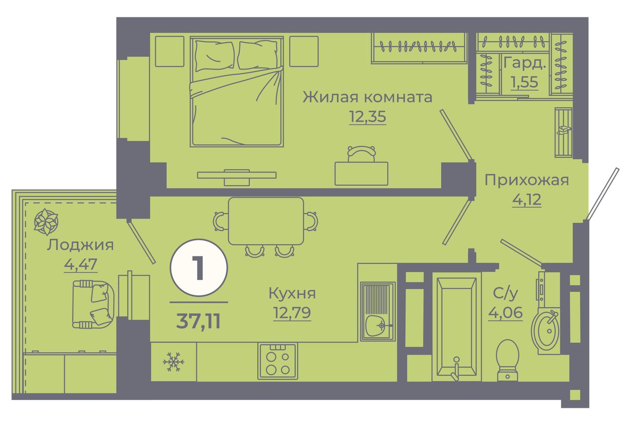 Жилая площадь12,35 м²