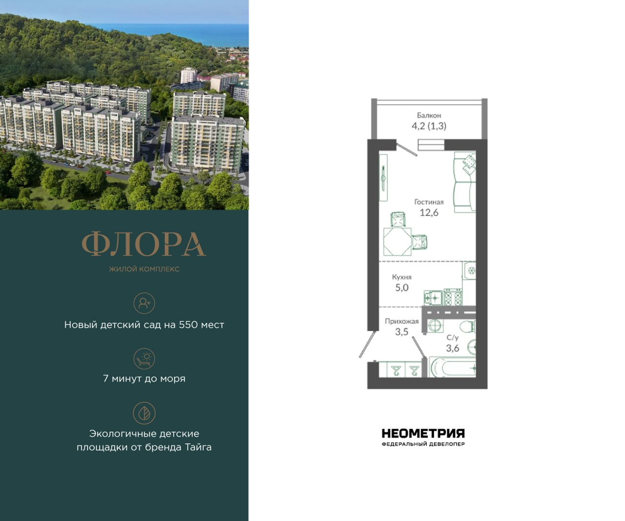 Продается квартира в ЖК «Флора» от федерального девелопера «Неометрия». Это жилой комплекс комфорт-класса в самом зеленом районе Сочи. При проектировании постарались максимально сохранить окружающую флору и фауну. Теплое море, горы, целебные источники, река, близость заповедника – все это уже рядом с вами.