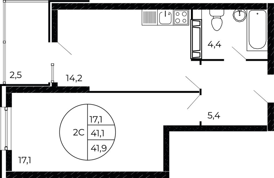1-комнатная — 41,19 м² 10/17 эт. в Флора
