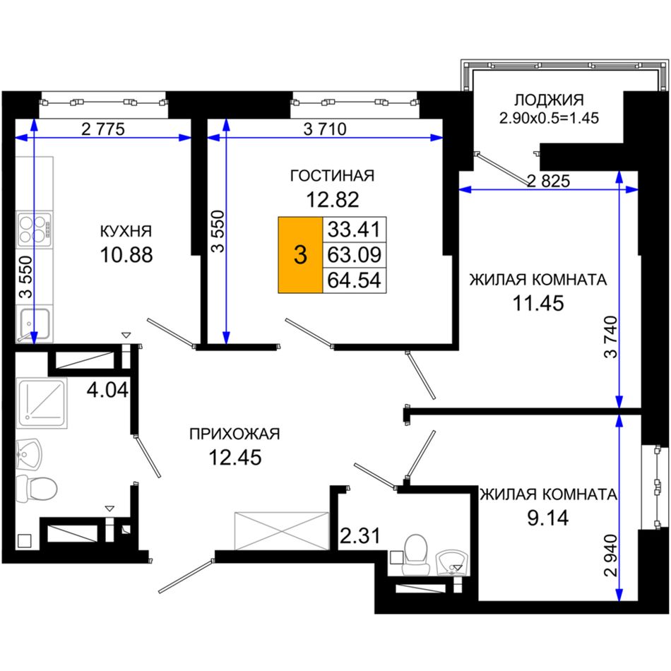 3-комнатная — 64,54 м² 21/25 эт. в Октябрь Парк