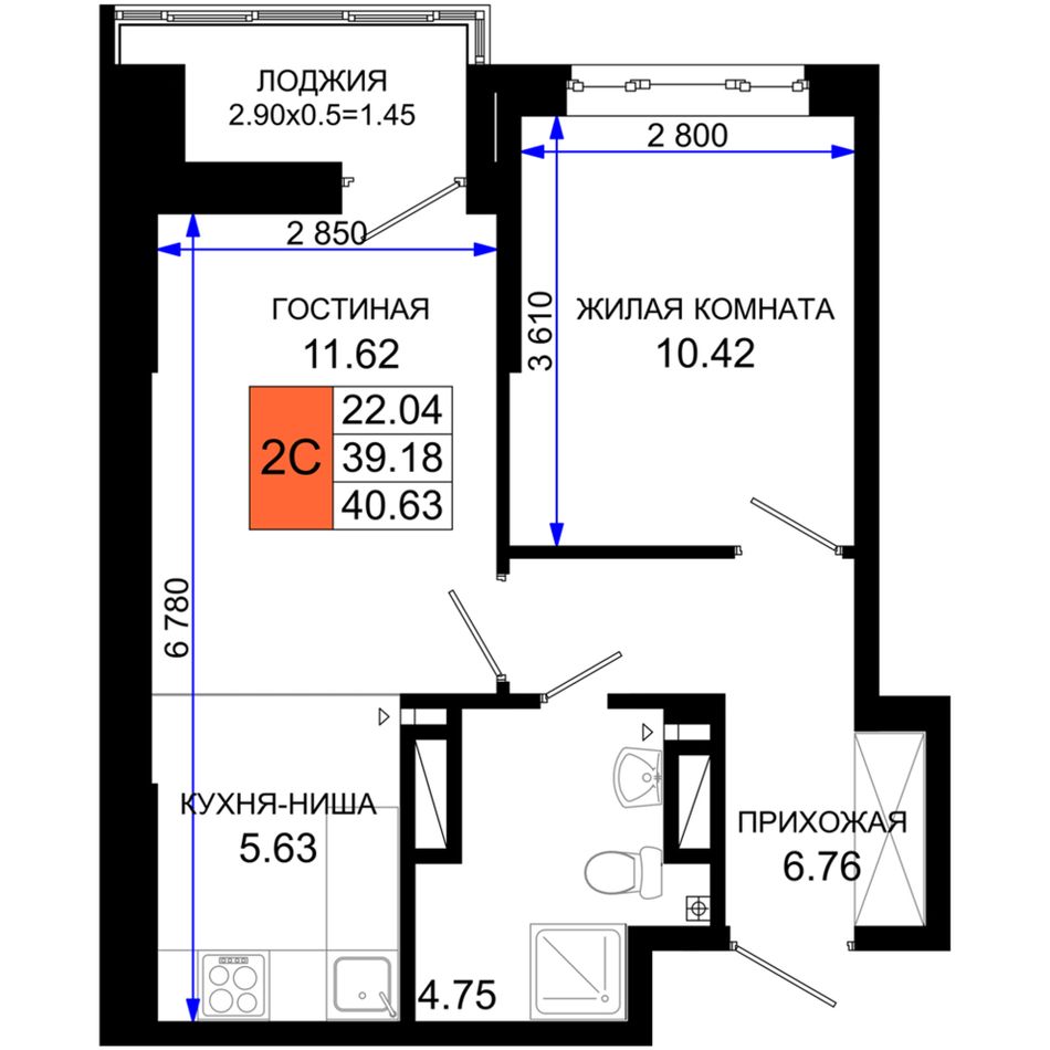 1-комнатная — 40,63 м² 18/25 эт. в Октябрь Парк