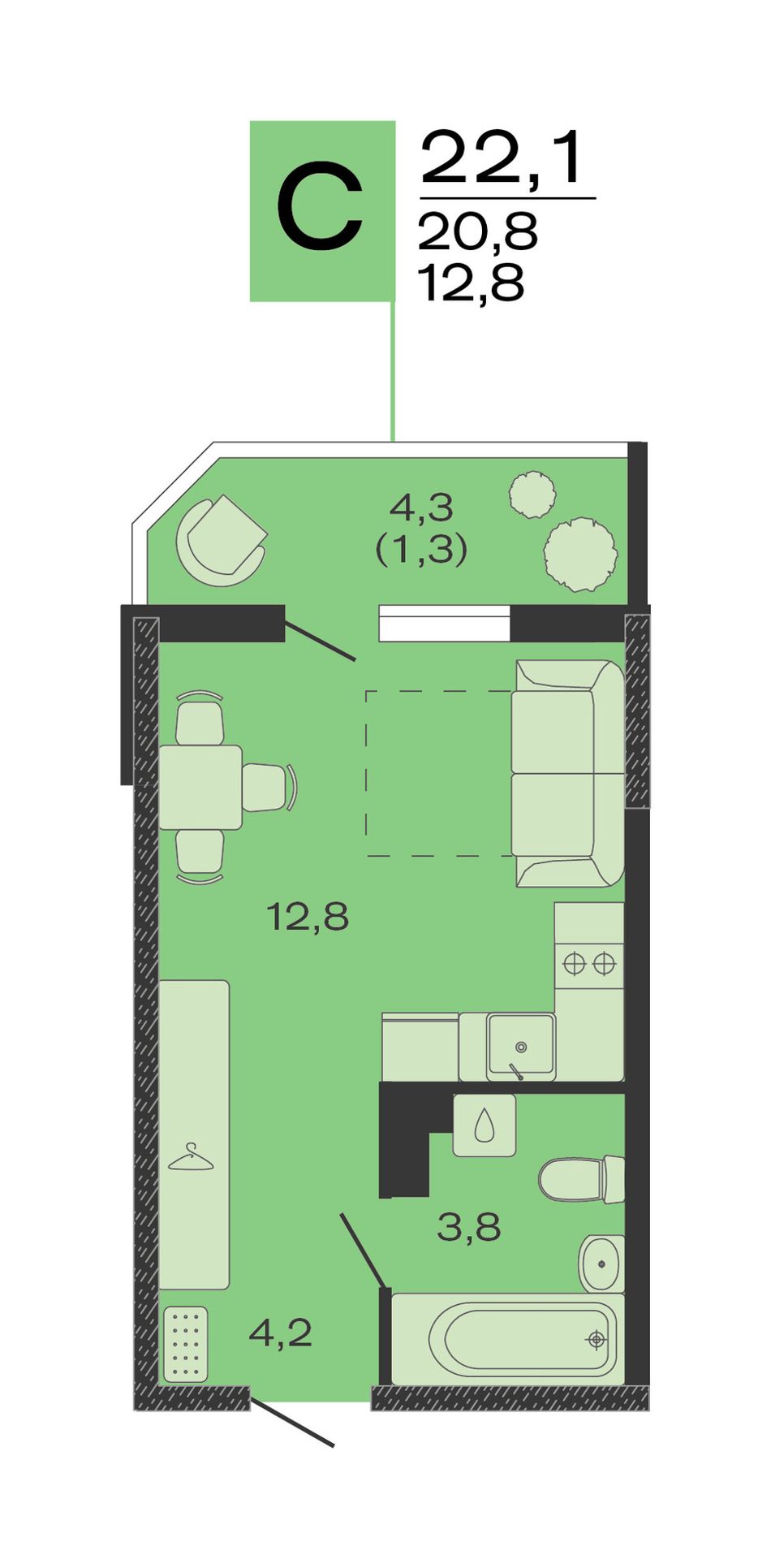 Студия — 22,1 м² 3/4 эт. в Дзенпарк
