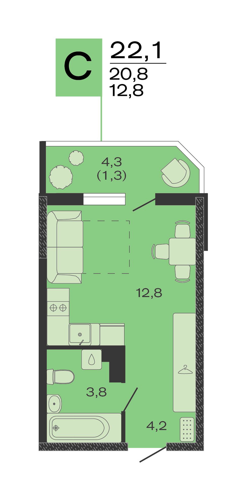 Студия — 22,1 м² 4/4 эт. в Дзенпарк