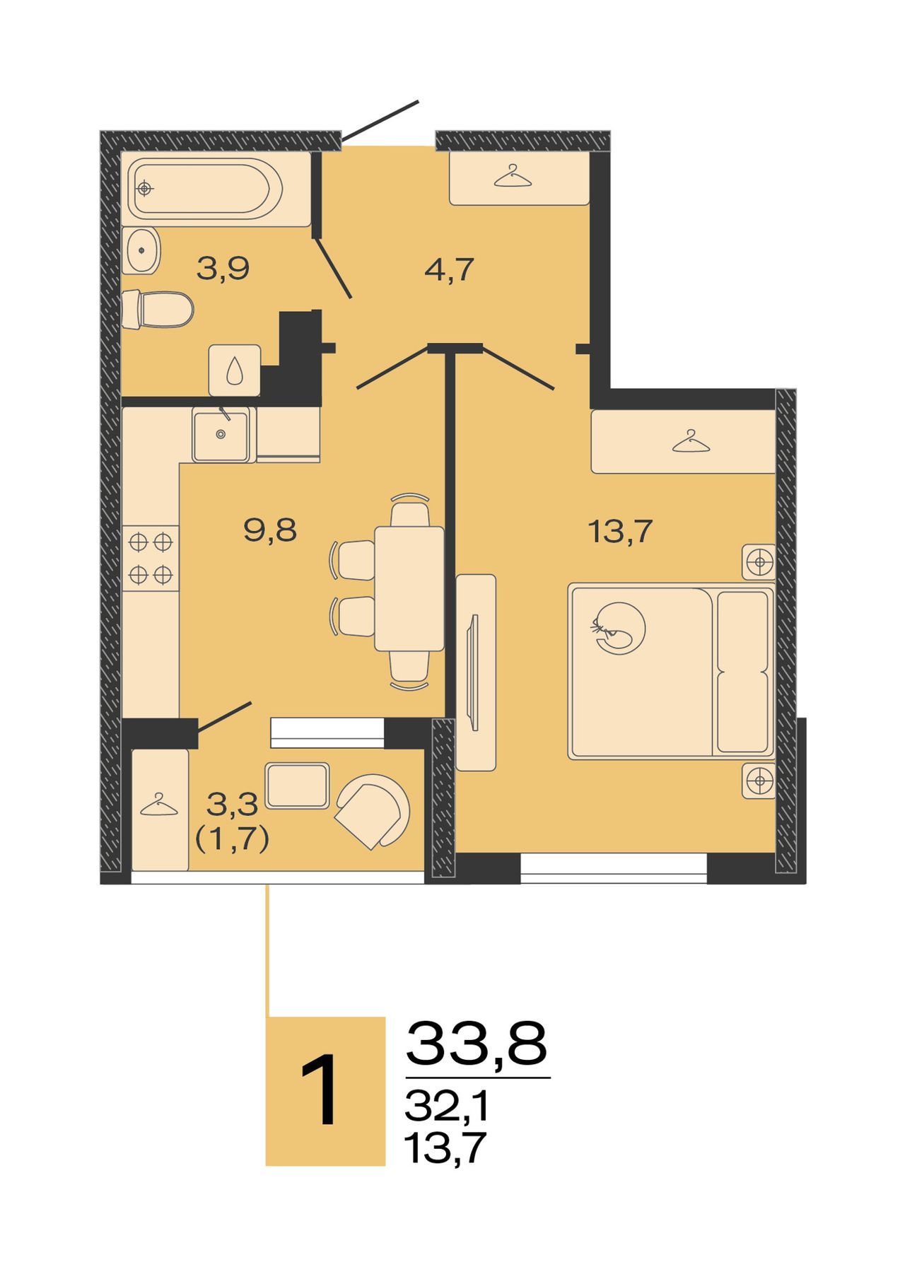 1-комнатная — 33,8 м² 4/4 эт. в Дзенпарк