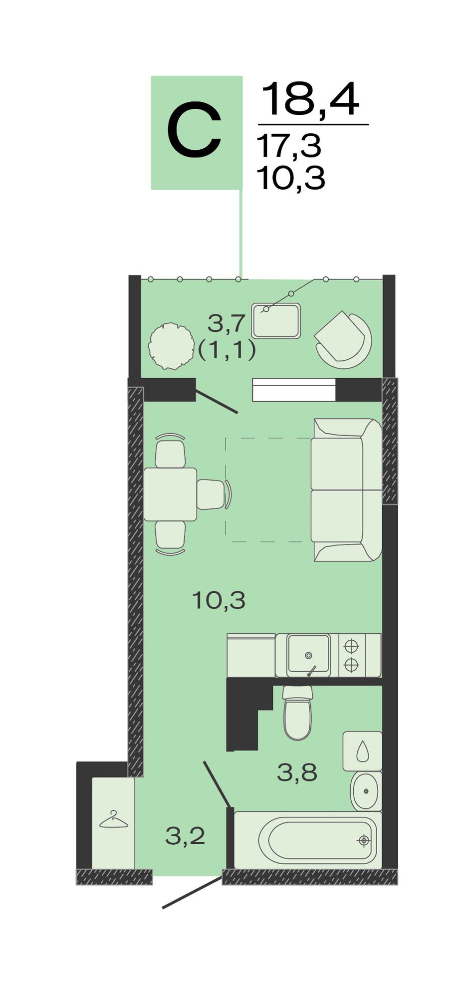 Общая площадь18,4 м²