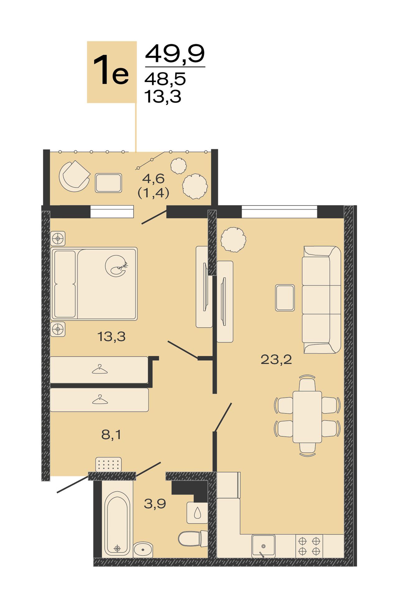 1-комнатная — 49,9 м² 1/4 эт. в Дзенпарк