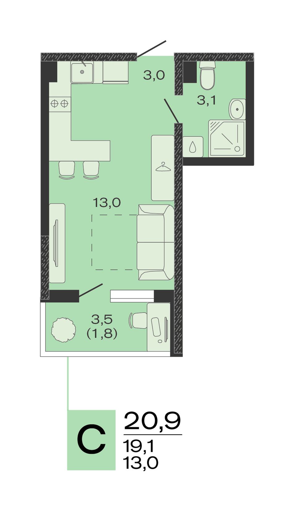 Студия — 20,9 м² 1/4 эт. в Дзенпарк