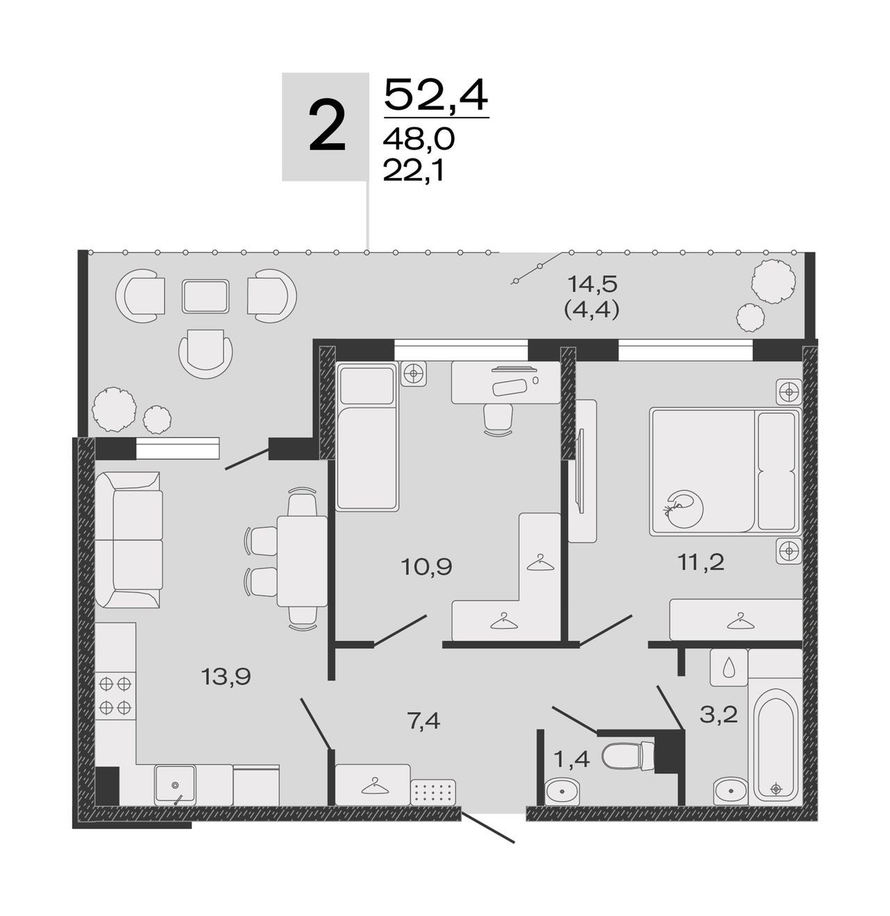 Общая площадь52,4 м²