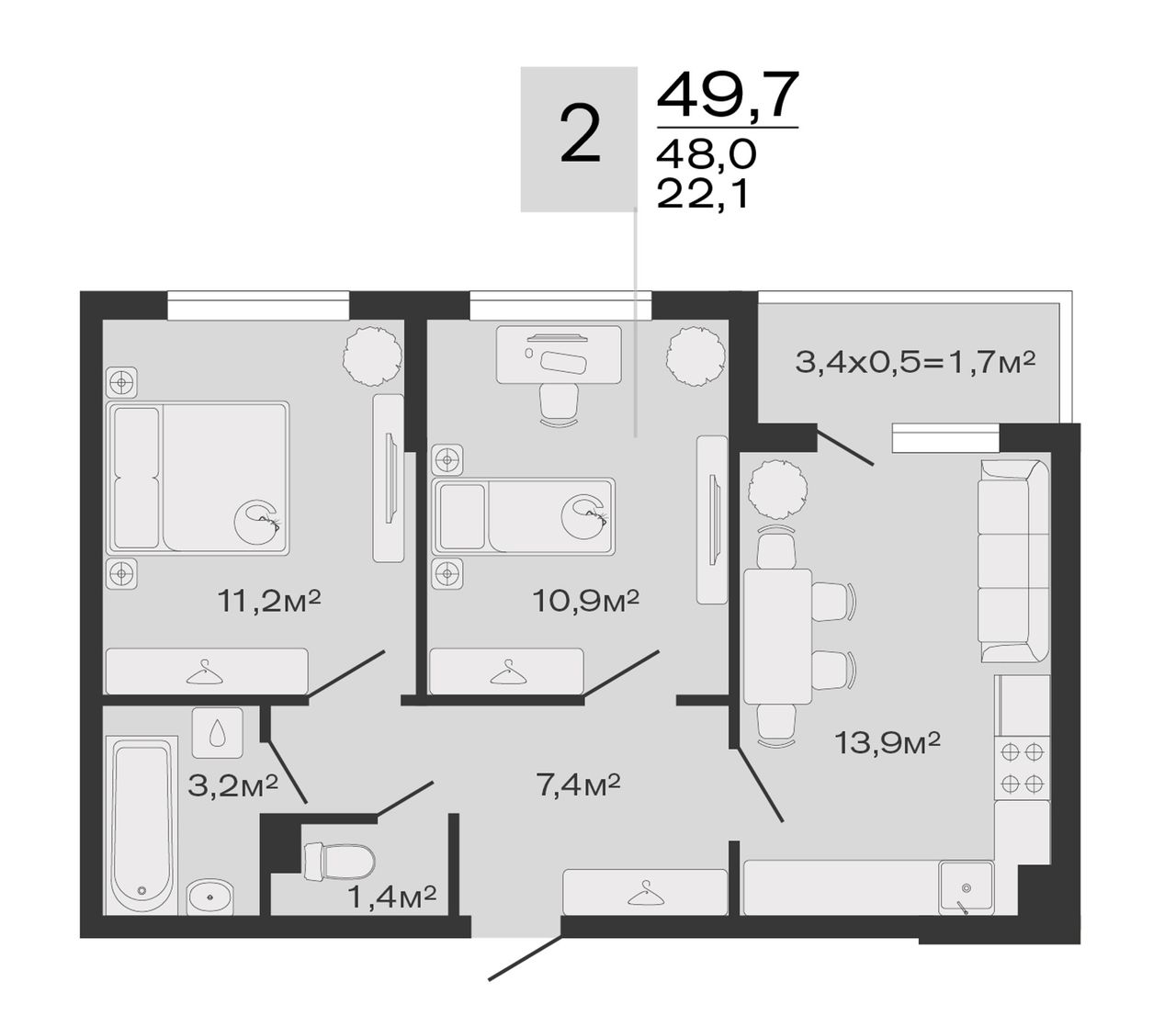2-комнатная — 49,7 м² 4/4 эт. в Дзенпарк