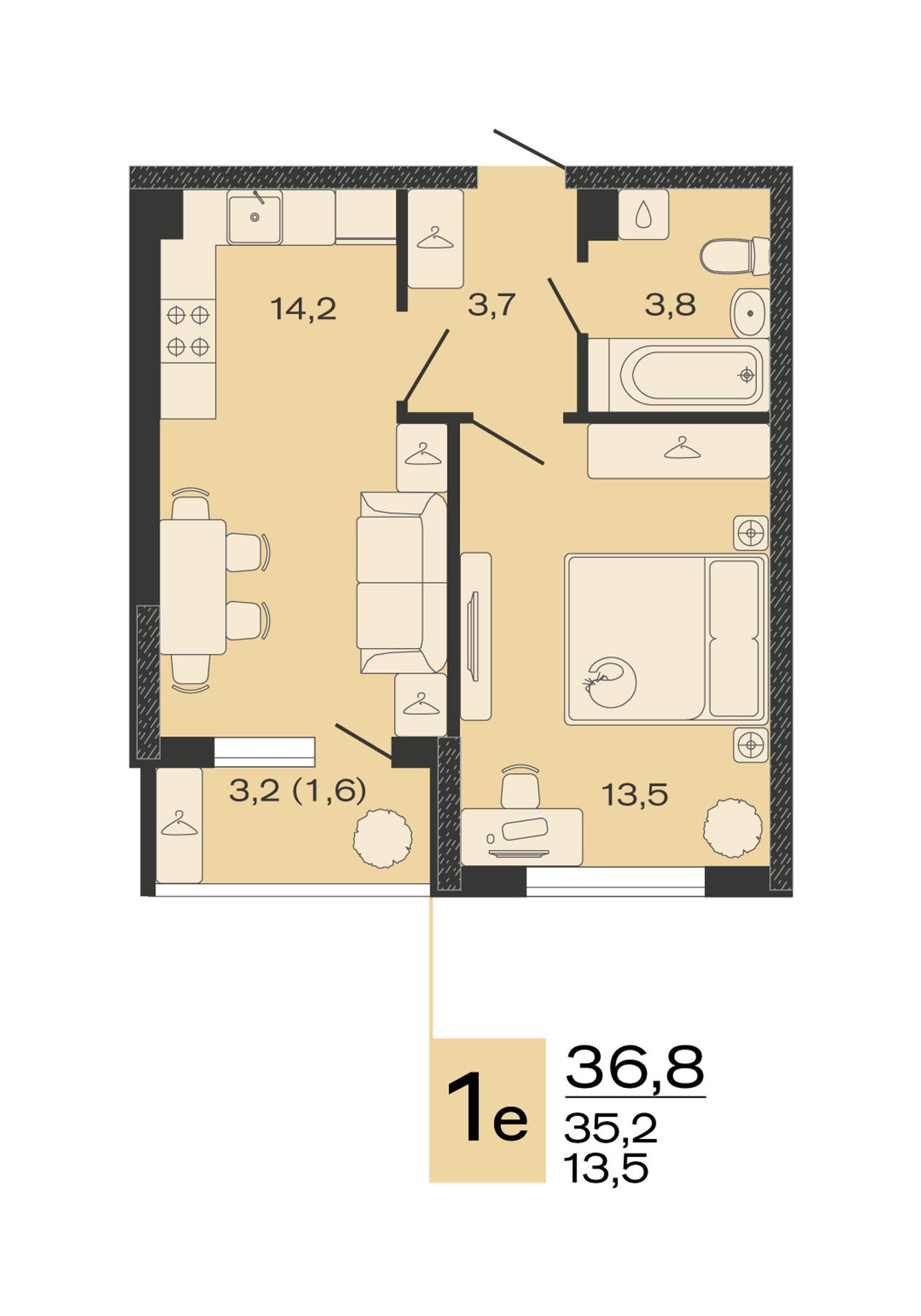 1-комнатная — 36,8 м² 2/4 эт. в Дзенпарк