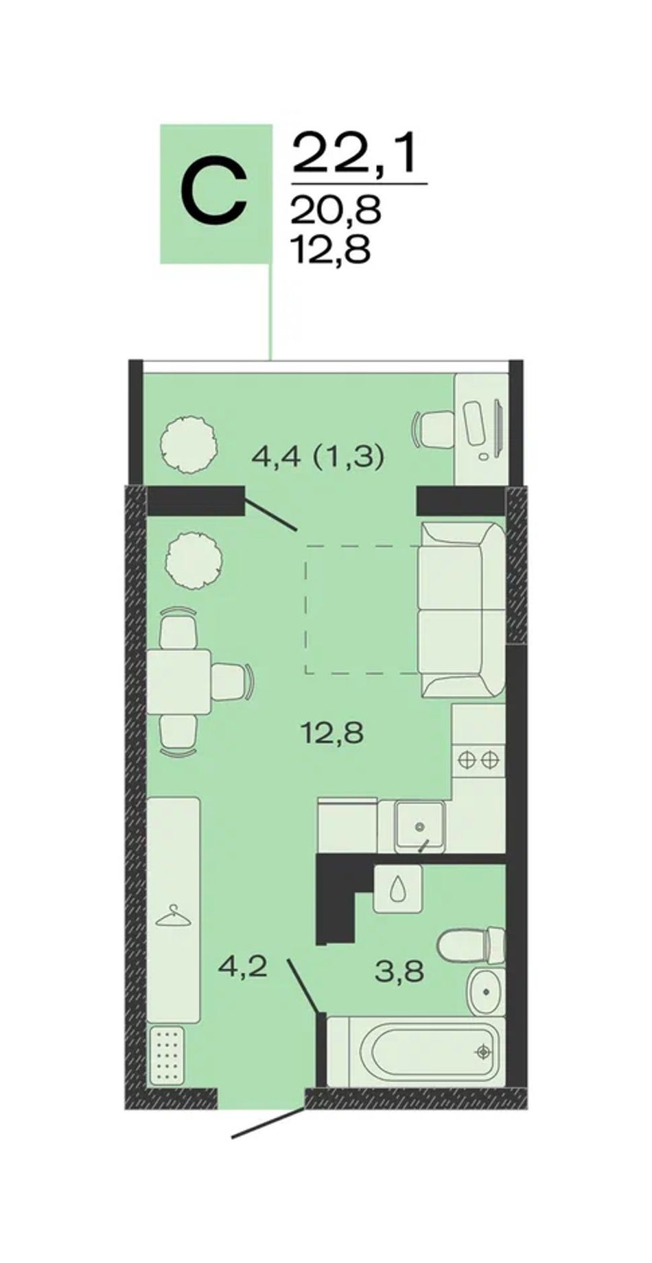 Студия — 22,1 м² 4/4 эт. в Дзенпарк
