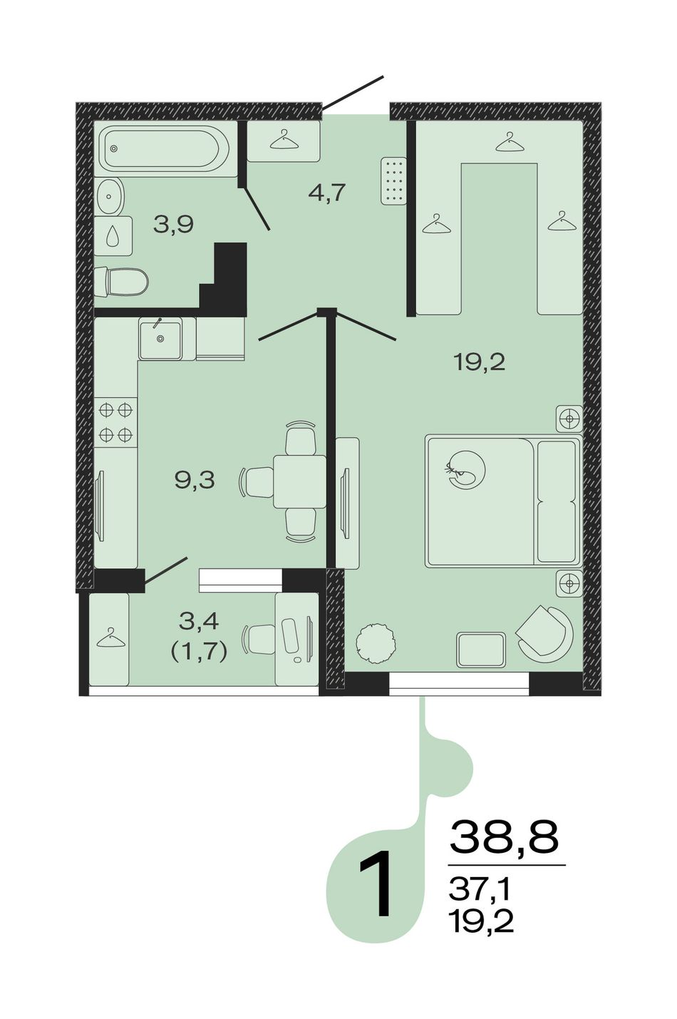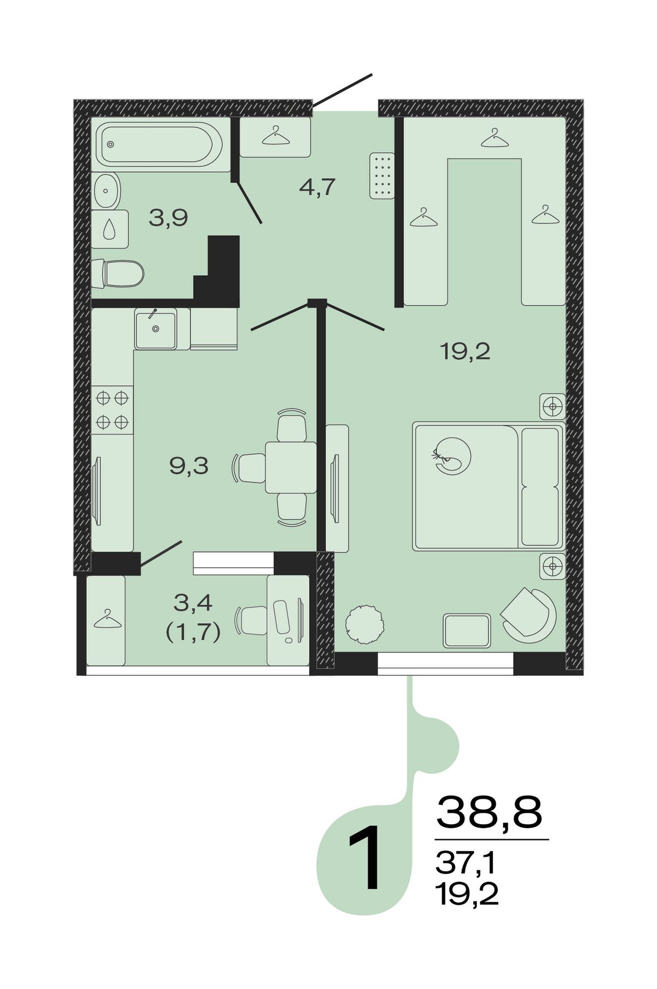 1-комнатная — 38,8 м² 2/4 эт. в ЭВО