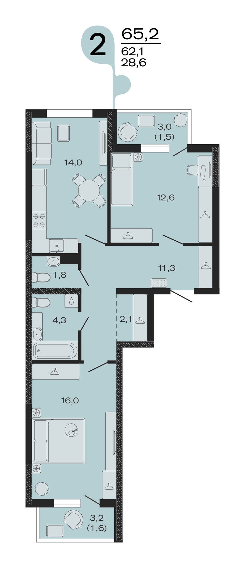 2-комнатная — 65,2 м² 1/4 эт. в ЭВО