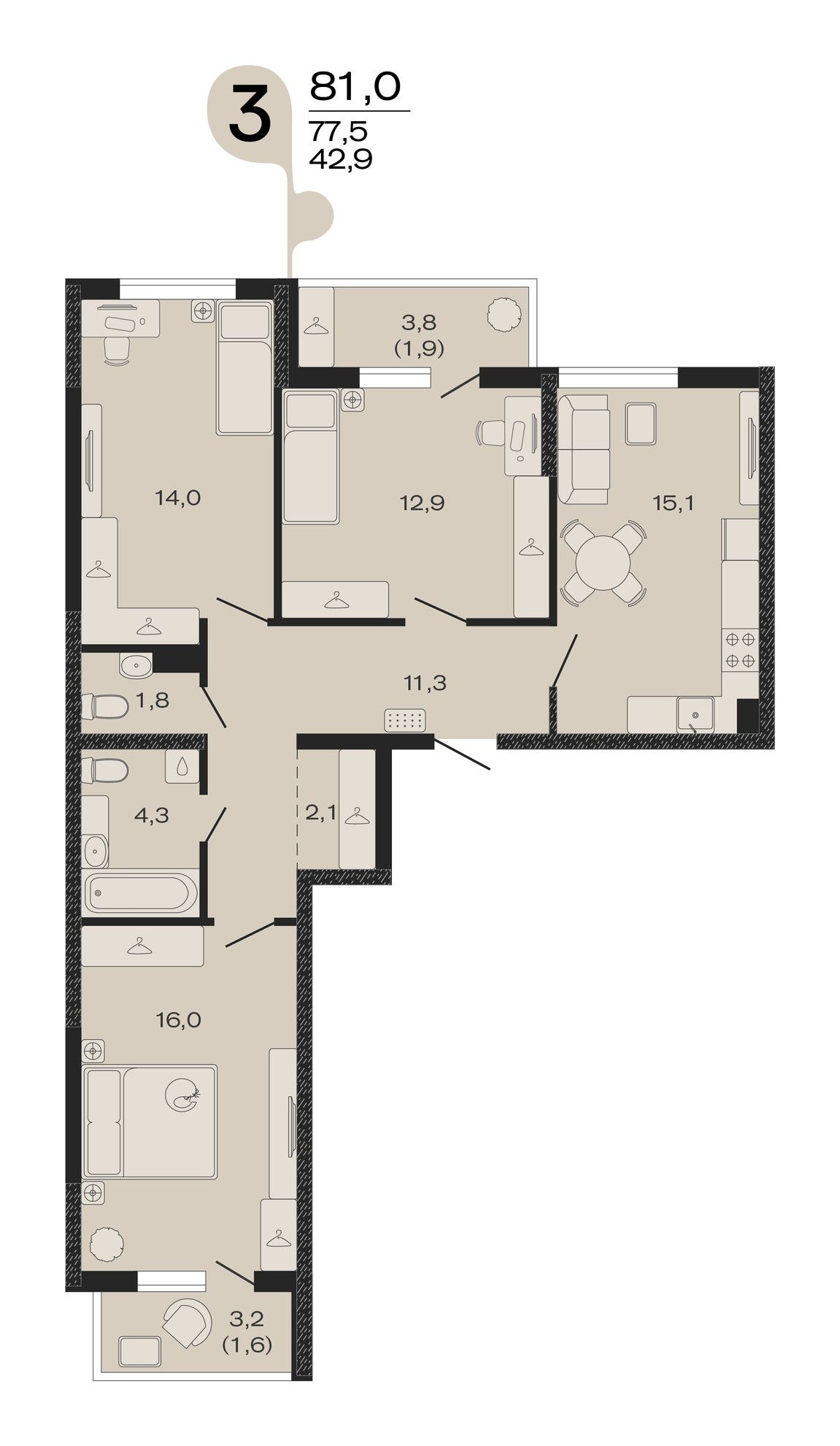 3-комнатная — 81 м² 3/4 эт. в ЭВО
