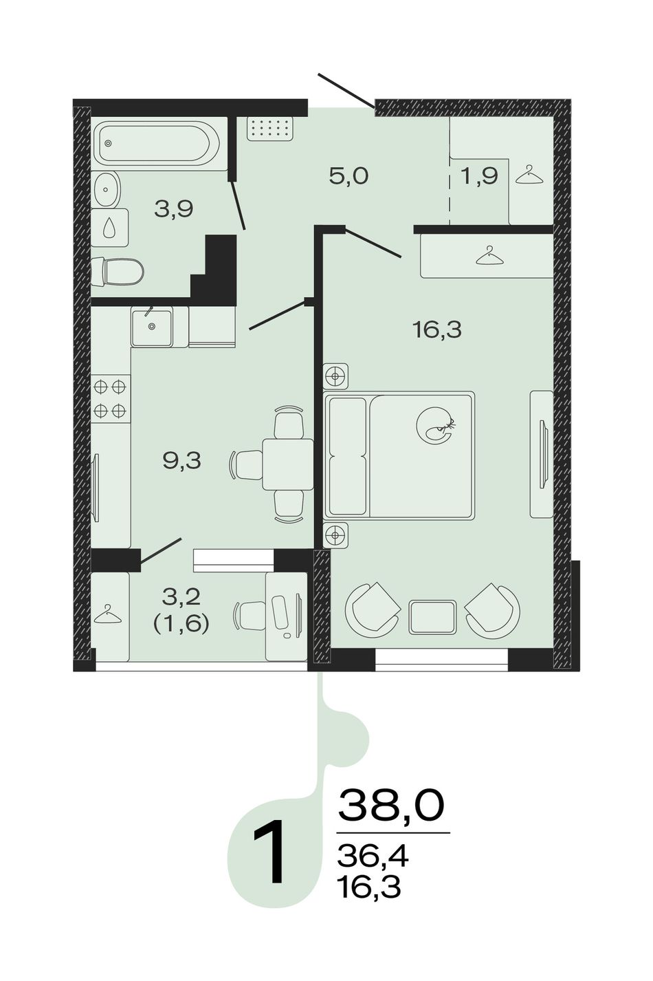 1-комнатная — 38 м² 1/4 эт. в ЭВО