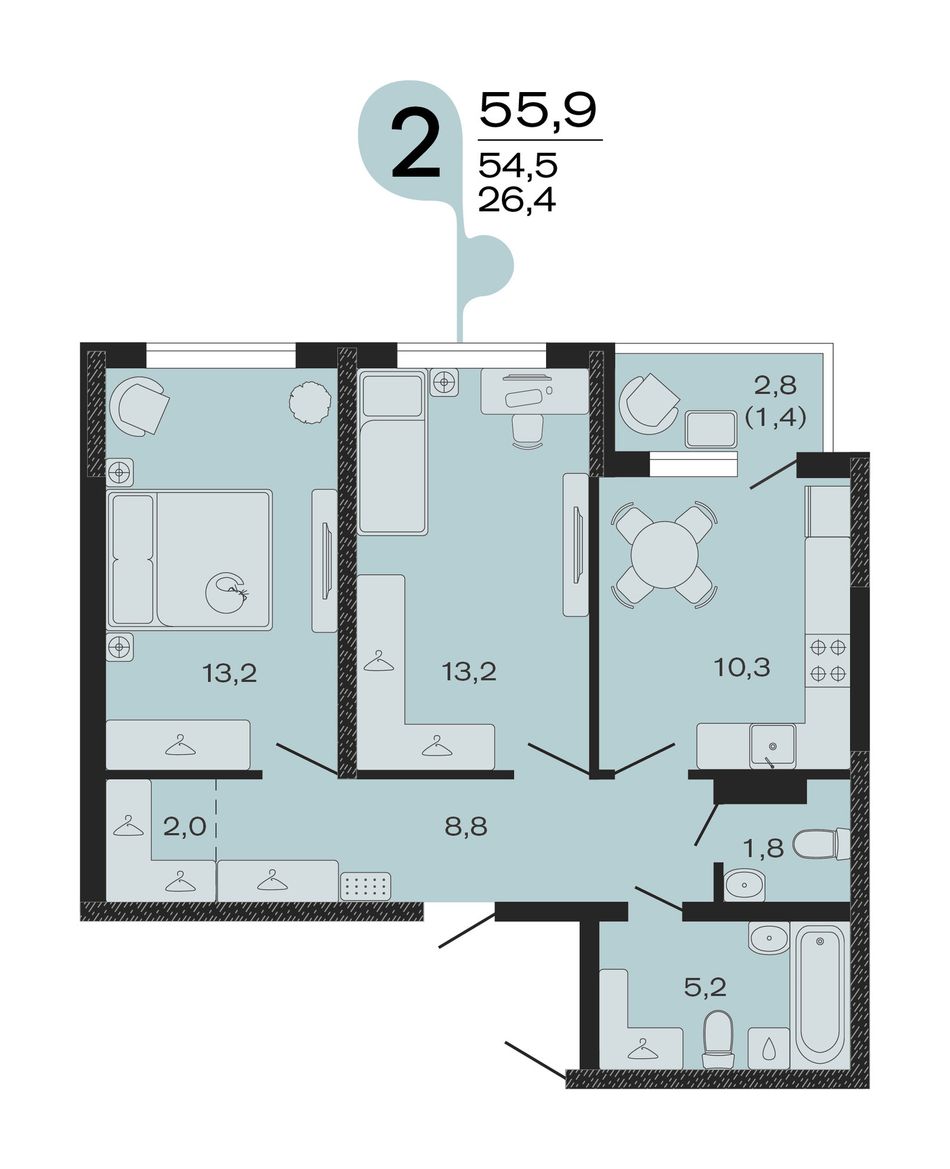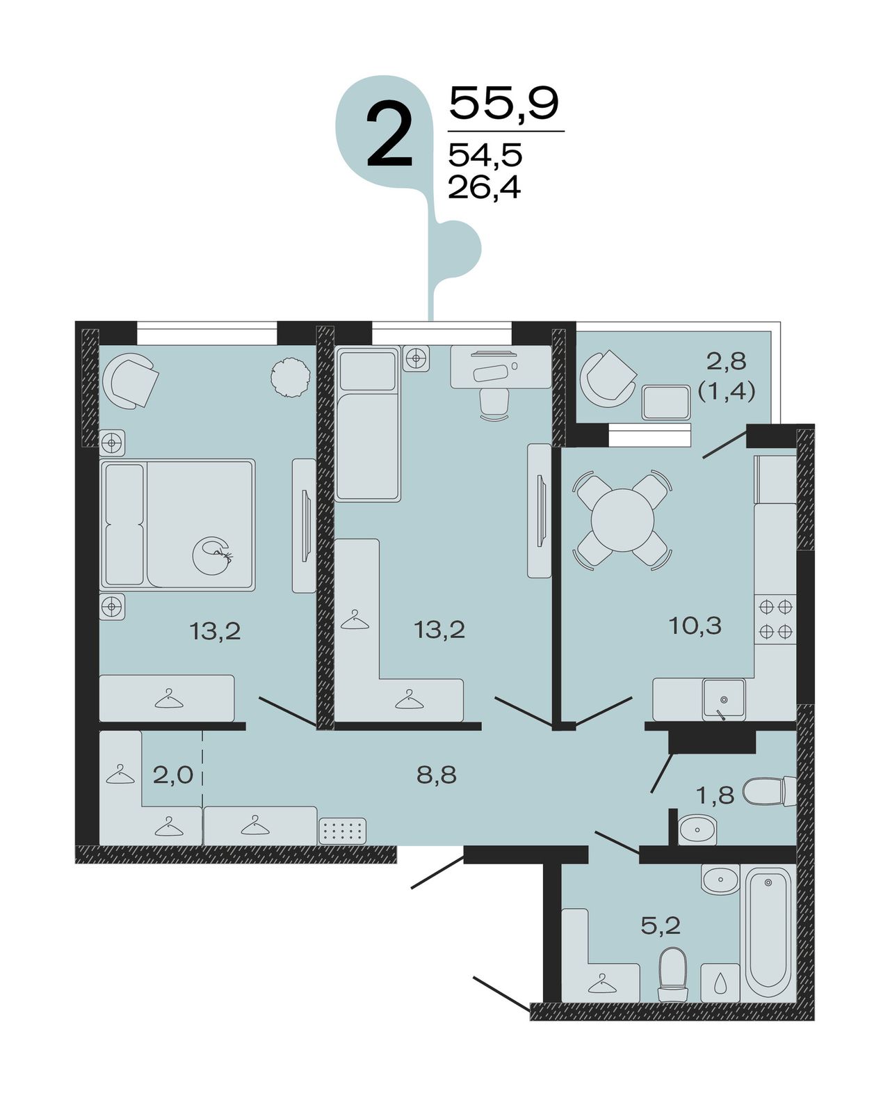 2-комнатная — 55,9 м² 1/4 эт. в ЭВО