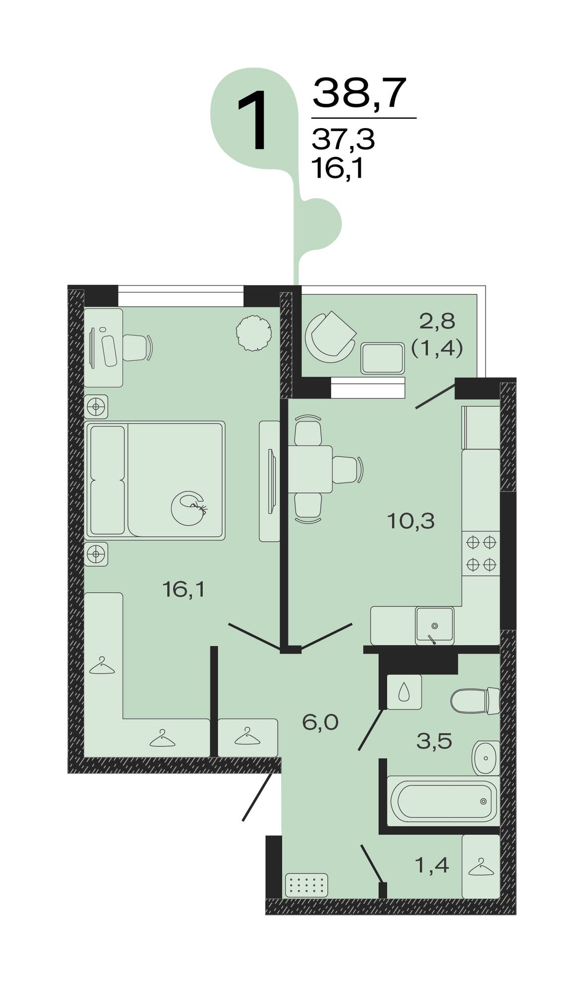 Общая площадь38,7 м²