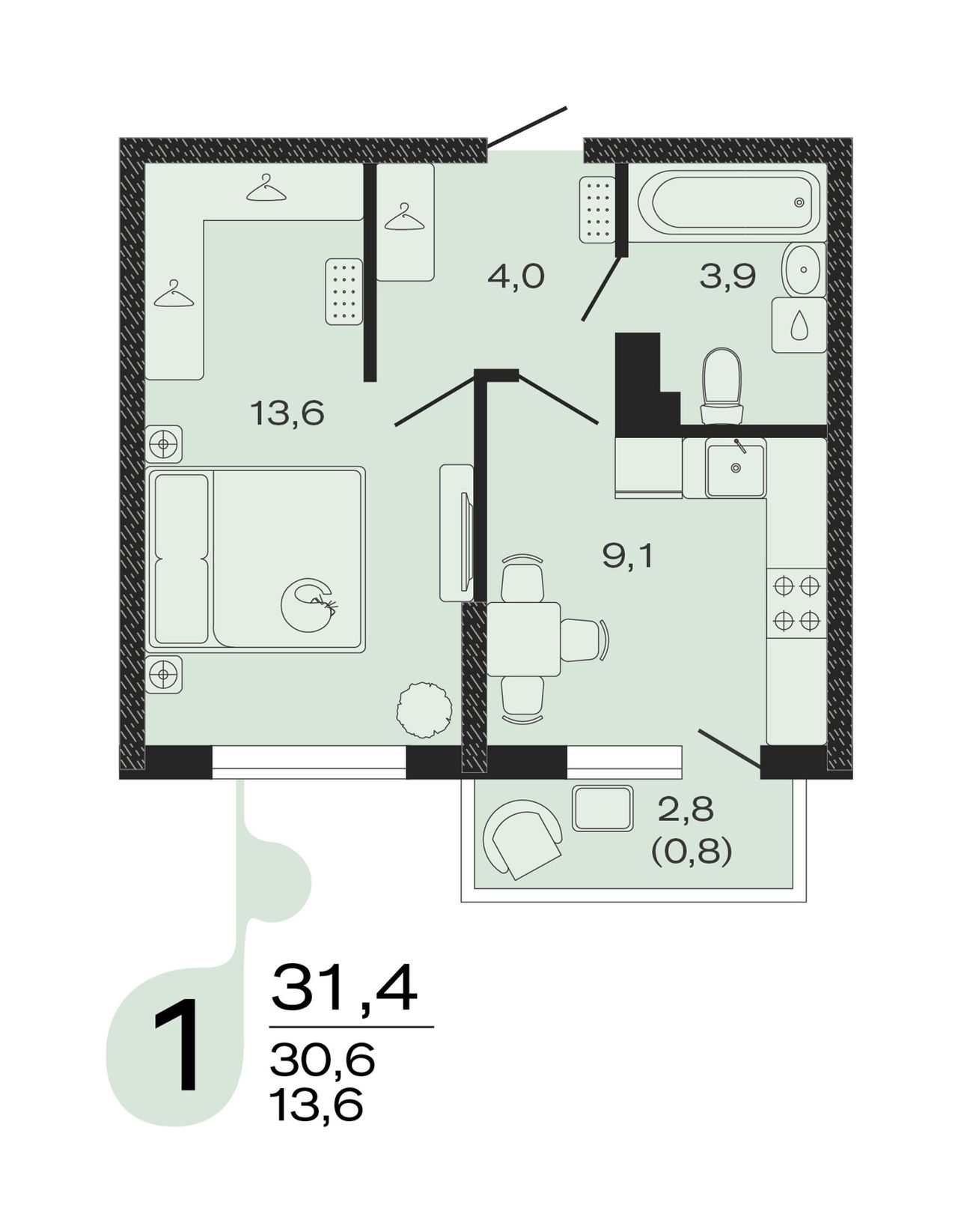 1-комнатная — 31,4 м² 4/4 эт. в ЭВО