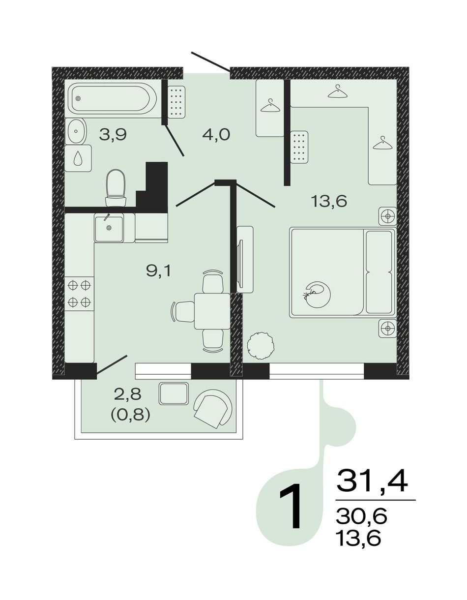 1-комнатная — 31,4 м² 2/4 эт. в ЭВО