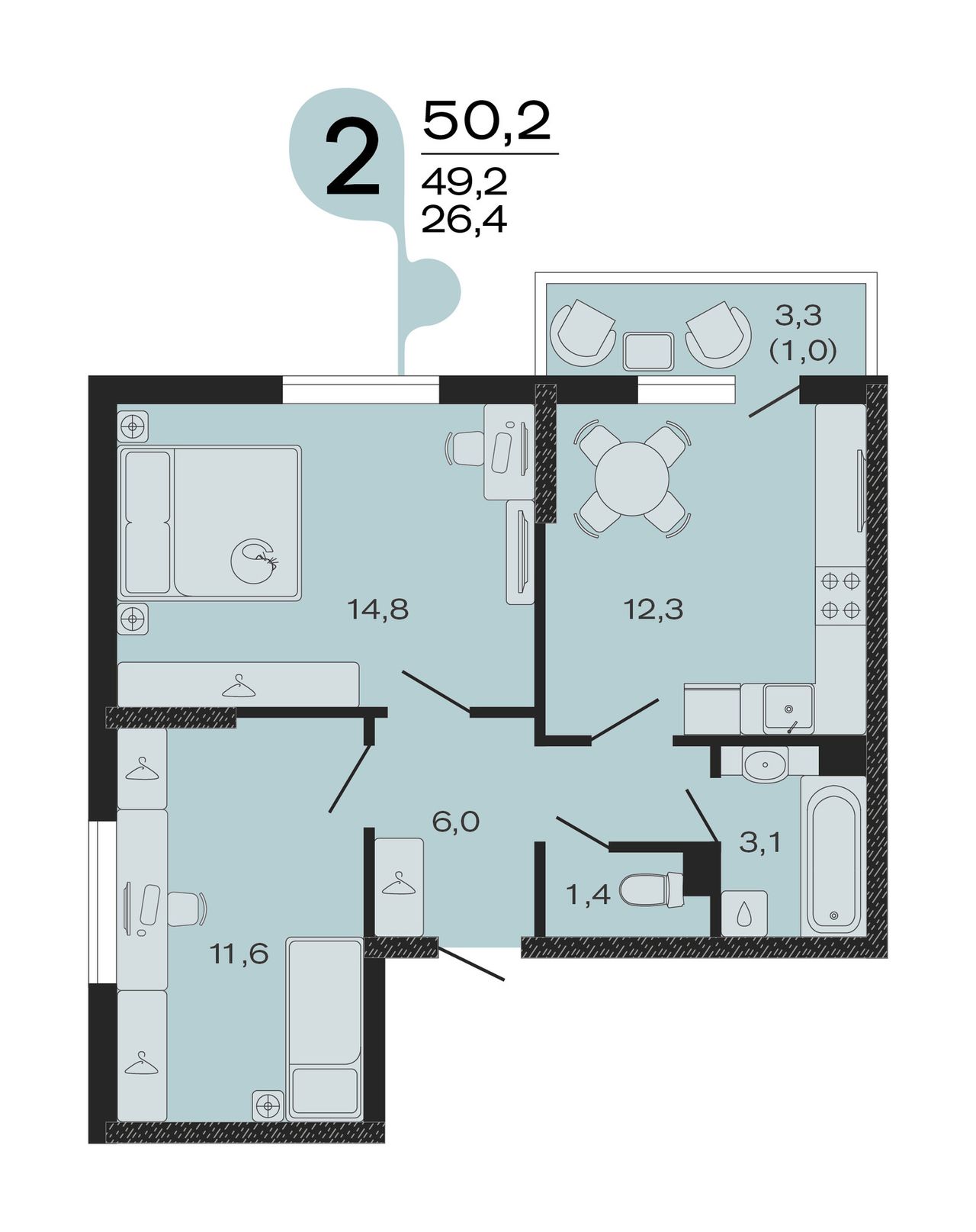 2-комнатная — 50,2 м² 4/4 эт. в ЭВО