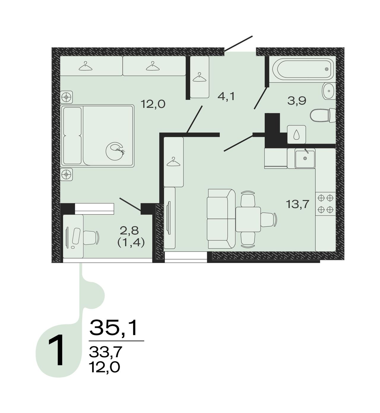 1-комнатная — 35,1 м² 1/4 эт. в ЭВО