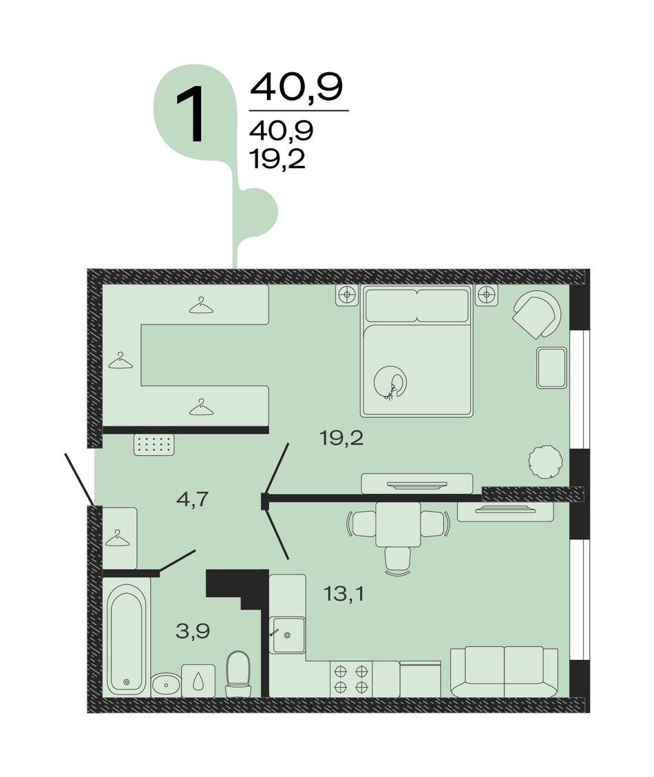1-комнатная — 40,9 м² 1/4 эт. в ЭВО
