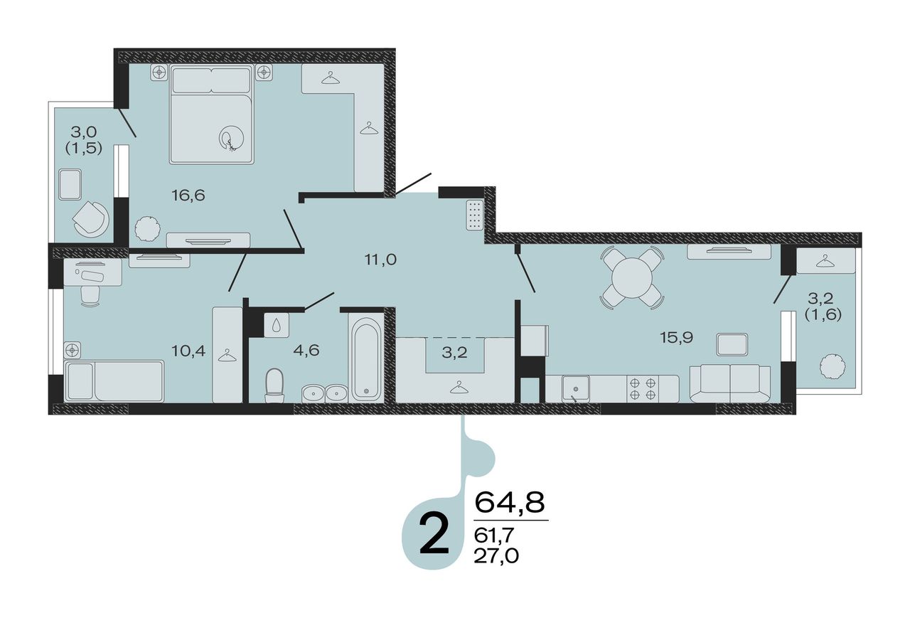 2-комнатная — 64,8 м² 1/4 эт. в ЭВО