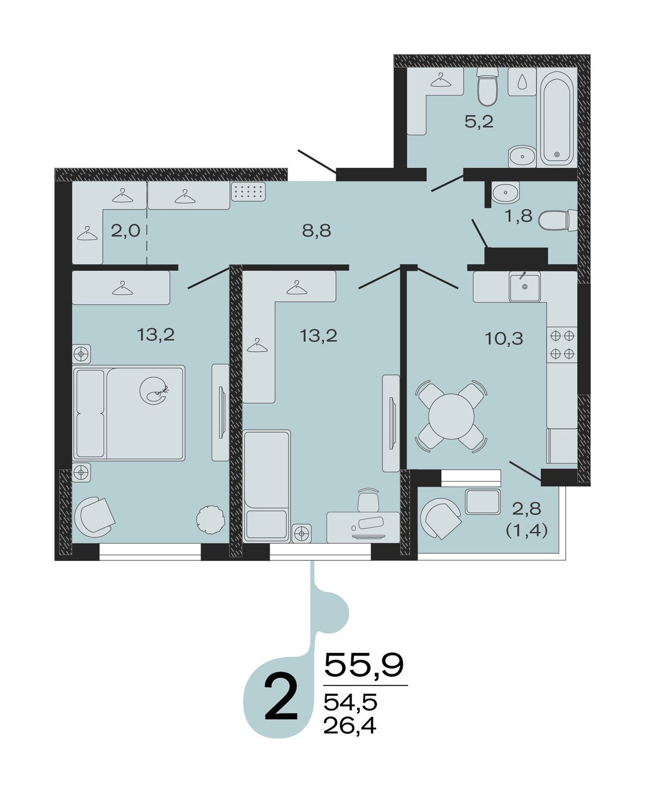 Общая площадь55,9 м²